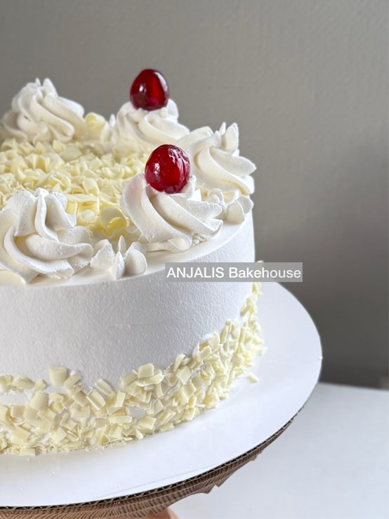 Indulge in our decadent white forest cake, featuring moist chocolate sponge soaked in cherry syrup, layered with rich cherry compote and chocolate shreds 🍒🍫.