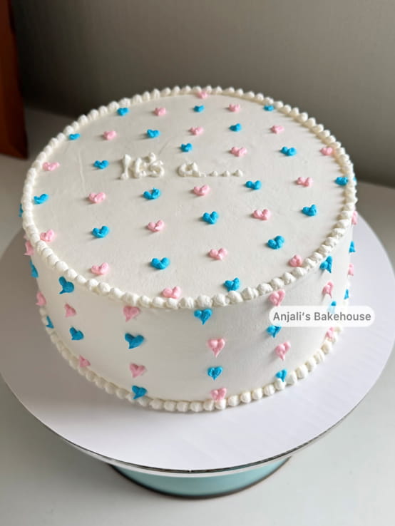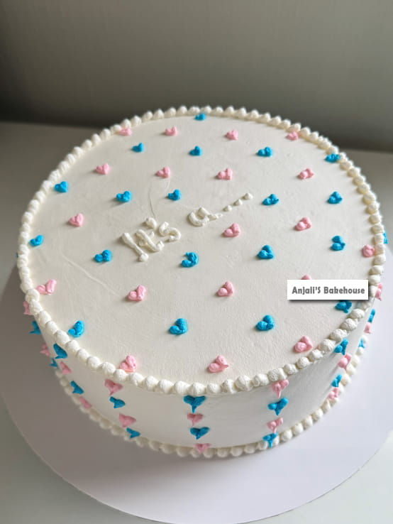 A full white gender reveal cake with baby pink and blue hearts and cute “It’s a….” text. Size selectable from our size chart. Inside color to be shared while ordering.