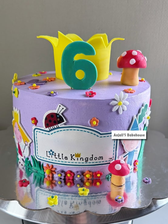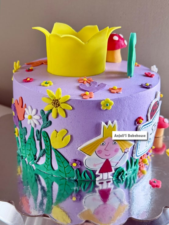 Bring the enchantment of Ben and Holly to your child’s birthday with a delightful Ben and Holly birthday cake from Anjali’s Bakehouse. This whimsical purple cake features a yellow crown, birthday number, colorful flowers, red mushrooms, green leaves, and edible Ben and Holly cutouts. The sides are personalized with your child’s name and a miniature kingdom print, creating a magical centerpiece for any celebration. Fully customizable in flavor and size, this cake combines playful design with delicious taste, making your child’s special day unforgettable.