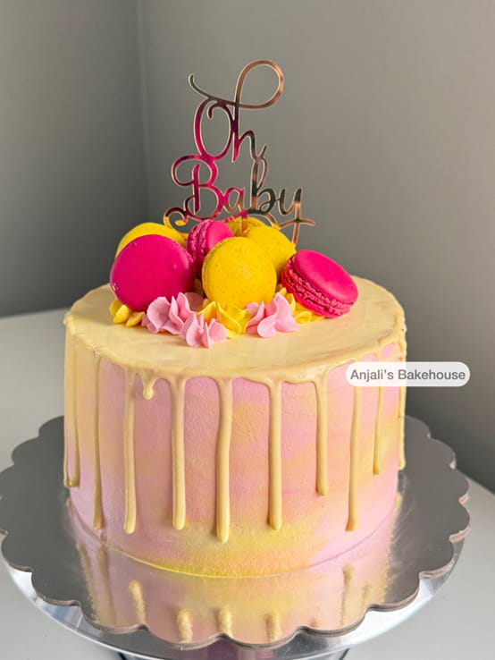 This delightful baby shower cake features soft baby pink and yellow shades, giving it a cheerful and elegant look. The cake is decorated with chocolate drips for a trendy and stylish touch. The top is beautifully adorned with pink and yellow macaroons and finished with a sparkling “Oh Baby” golden topper, making it a perfect centerpiece for your baby shower celebration.